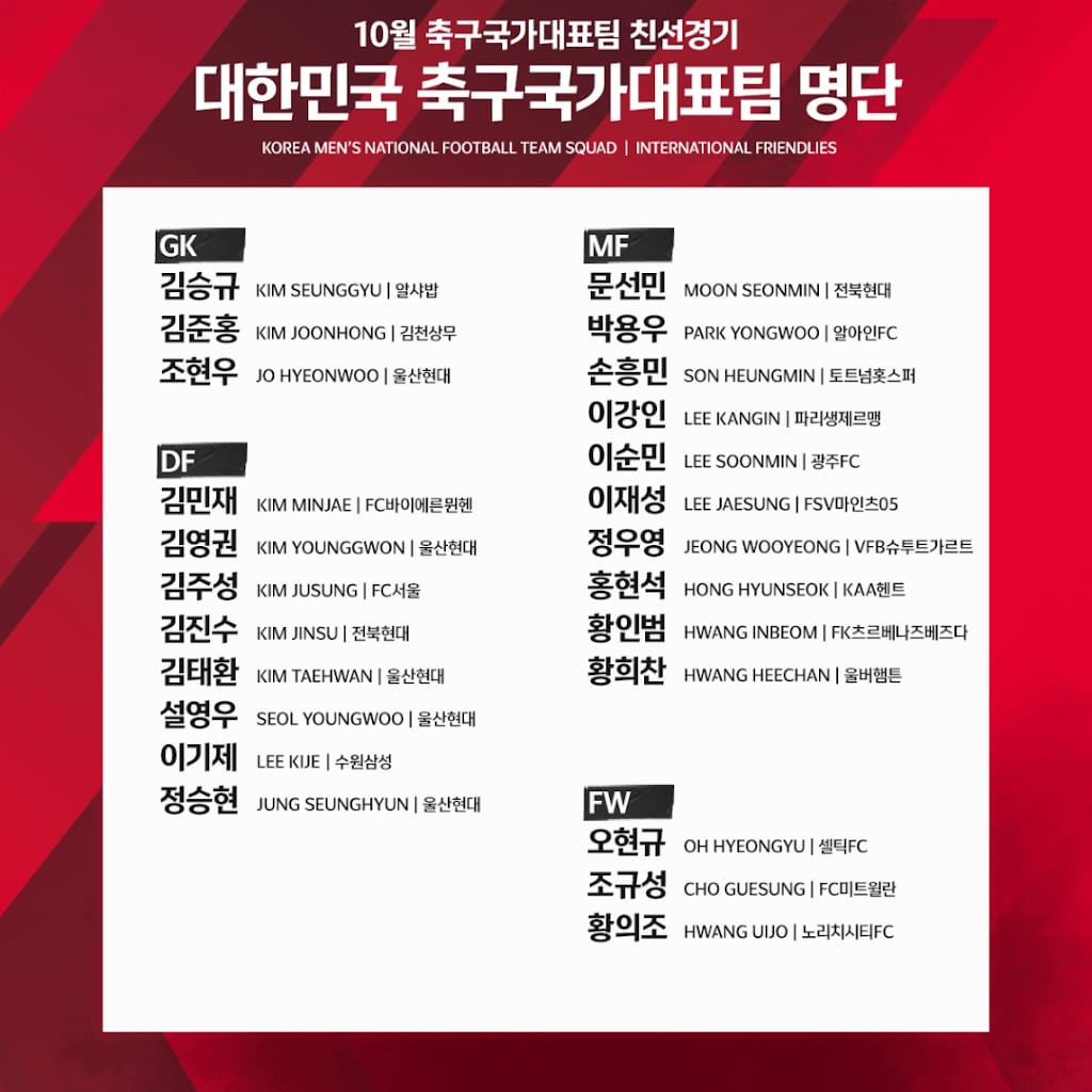 – 제외 선수 : 양현준, 이동경, 김지수, 안현범, 강상우