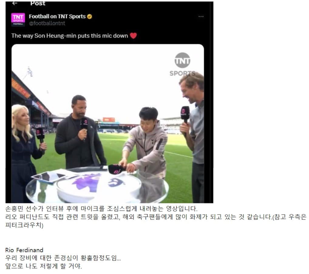 퍼디난드 曰 “최근 손흥민의 행동을 보고 황홀할 정도로 감동받았어! 내가 뭘 봤냐면…”이기타2023년 10월 13일축구최근 인터뷰가 끝나고 현지에서 화제가 된 손흥민의 태도.마이크를 공손하게 내려놓으며 현지에서도 예의 바르다며 극찬을 아끼지 않았다.급기야 진행자였던 퍼디난드까지 이 모습을 리스펙했다.실력에 인성까지 갖췄으니 현지에서도 이뻐하지 않을 수 없지 ㅋㅋㅋ