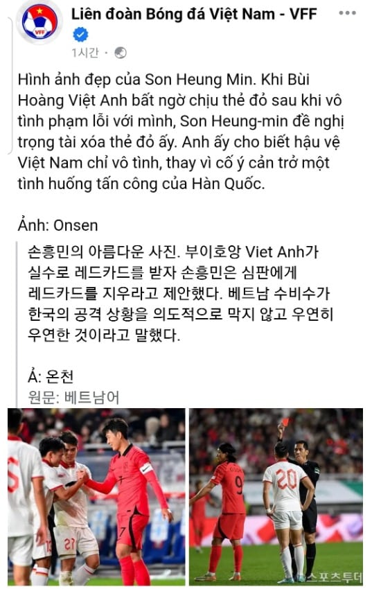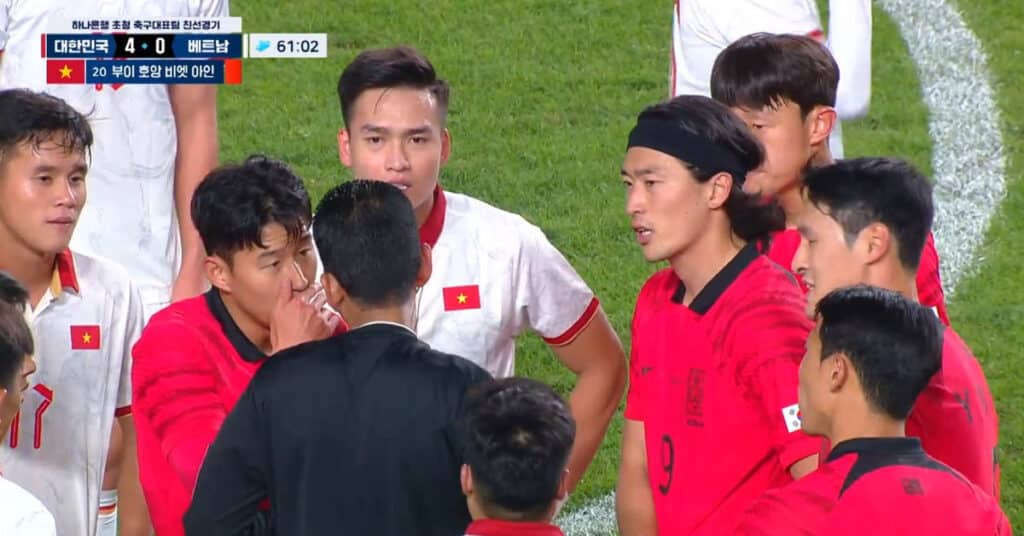 “이게 퇴장이라고요?” 분명 ‘베트남’이 퇴장당했는데 오히려 주심에게 항의하기 시작한 ‘손흥민’이기타2023년 10월 19일축구경기 도중 손흥민이 돌파하는 과정에서 태클을 날린 베트남 선수.주심은 곧바로 퇴장을 꺼냈다.명백한 득점 찬스를 저지하며 꺼내든 레드 카드.하지만 오히려 손흥민이 주심에게 “퇴장감은 아니었다”며 항의하기 시작했다.베트남 축구협회에서도 주목한 손흥민의 항의.사실 메이저 대회였으면 모르겠는데 평가전이라 넘어가는 것도 나쁘진 않았지 ㅋㅋㅋ