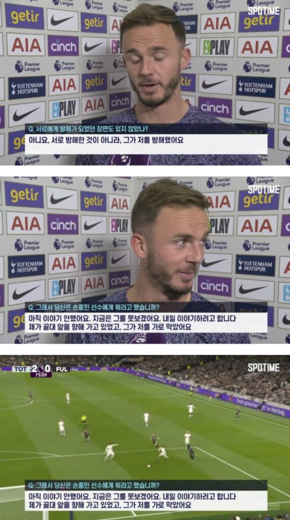 매디슨 曰 “풀럼전에서 제가 손흥민과 다퉜는데 그 이유가 뭐였냐면…”이기타2023년 10월 25일축구풀럼전에서 손흥민과 동선이 겹치며 슈팅 기회를 날려버린 매디슨.이후 두 사람 간 언쟁이 발생하며 화제가 되기도 했다.그러자 경기 후 입장을 밝힌 매디슨.말은 저래도 뉘앙스는 농담식이었다.프로들이니 경기장에서의 일은 경기장에서 끝이지.
