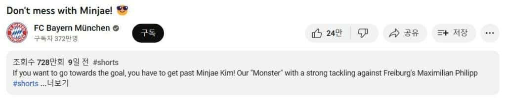“현지 반응 대폭발…” 환상적인 플레이 하나로 유튜브 좋아요 숫자만 20만 개 이상 폭발해버린 ‘김민재’이기타2023년 11월 02일축구 유튜브에서 700만 이상 조회수에 좋아요만 24만개 ㄷㄷㄷㄷㄷ