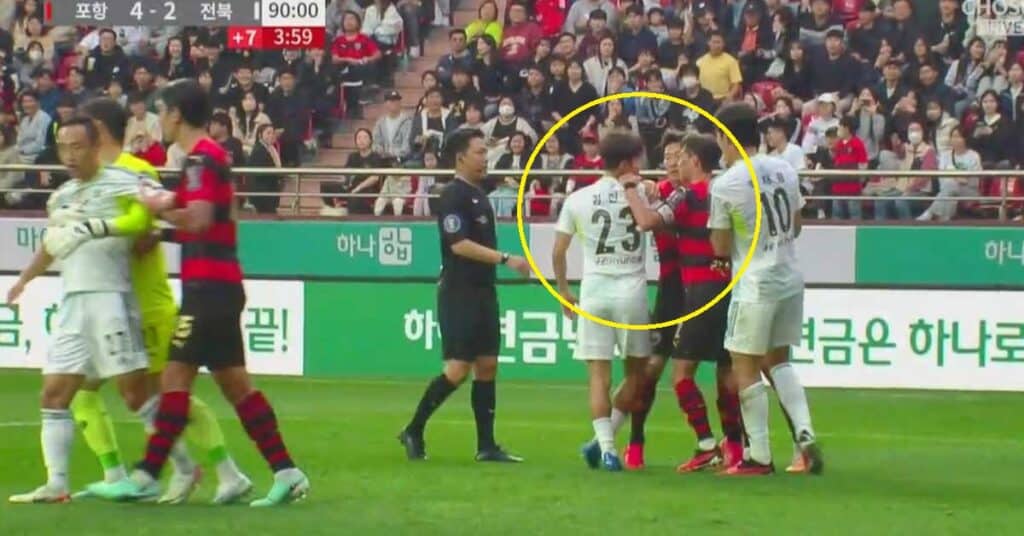 싸움은 ‘문선민’이 났는데 갑자기 뒤에서 달려와 포항 선수 멱살 잡아버리는 ‘김진수’