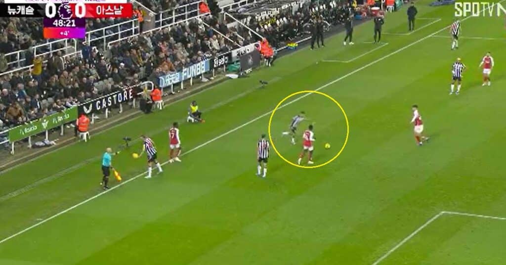 동료가 스로인 하려는데 갑자기 ‘아스날 선수’를 향해 예상치 못한 슈팅 궤적을 발사해버린 ‘기마랑이스’