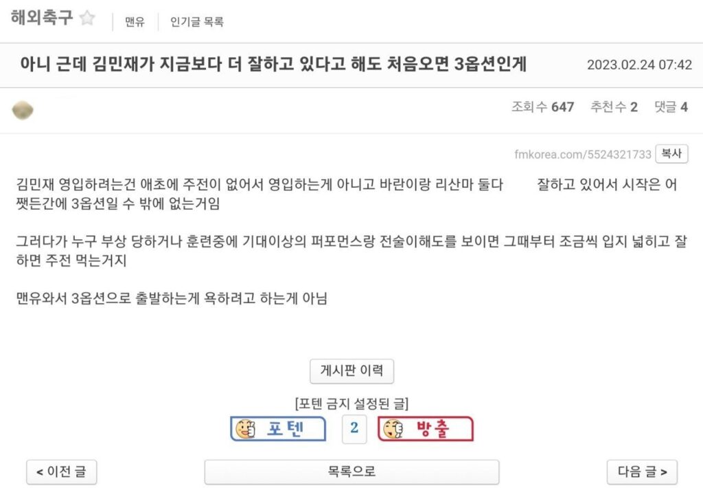 국내 맨유팬이 ‘김민재’가 맨유로 이적할 경우 3옵션에 불과하다고 주장해버린 이유이기타2023년 11월 09일축구나폴리 시절 맨유 이적설 났을 때 팬들 반응 ㅋㅋㅋㅋ이때만 해도 3옵션이라는 얘기가 많았는데 지금은…