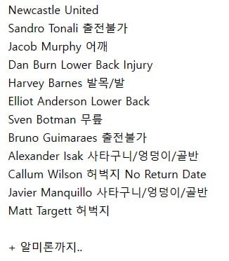 실제로 뉴캐슬 부상자 명단을 보면 토트넘이랑 다를 게 없다 ㄷㄷ
