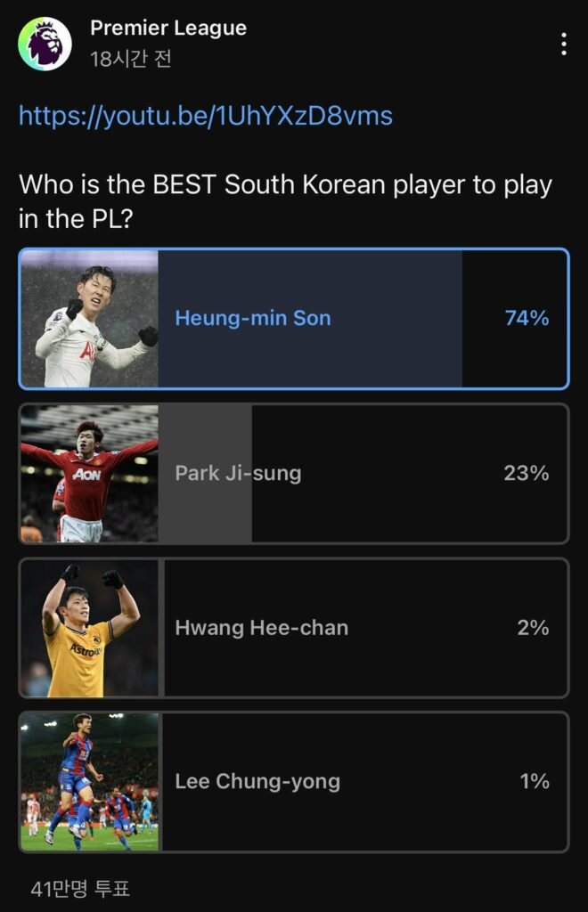 “박지성vs손흥민” 갑자기 등장한 ‘손박대전’ 토론 주제에 PL 현지팬들이 보인 반응이기타2024년 01월 09일축구현지에서 진행한 PL 최고의 한국인 선수 투표.무려 41만 명이 참가한 끝에 손흥민이 압도적 1위 ㄷㄷ