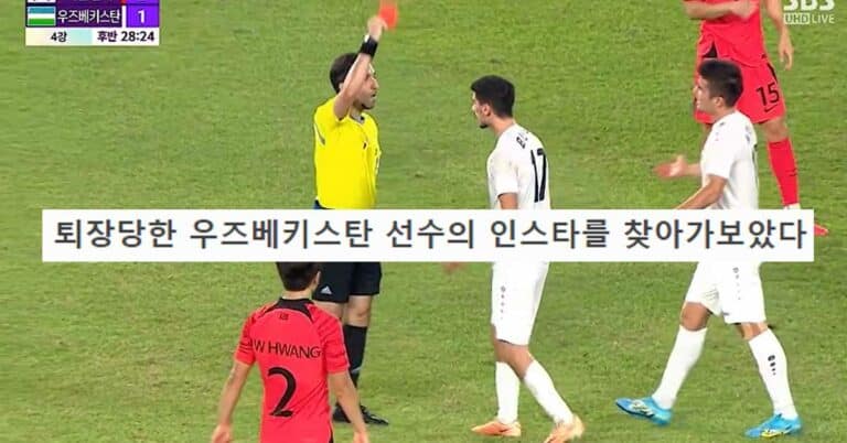 조영욱에게 거친 태클 박고 경고 누적으로 퇴장당한 우즈벡 선수. 그러자 빡친 한 축구팬이 이 선수 인스타를 굳이 찾아냈는데… 아 ㅋㅋㅋㅋㅋㅋㅋㅋ 다음부턴 조심하자