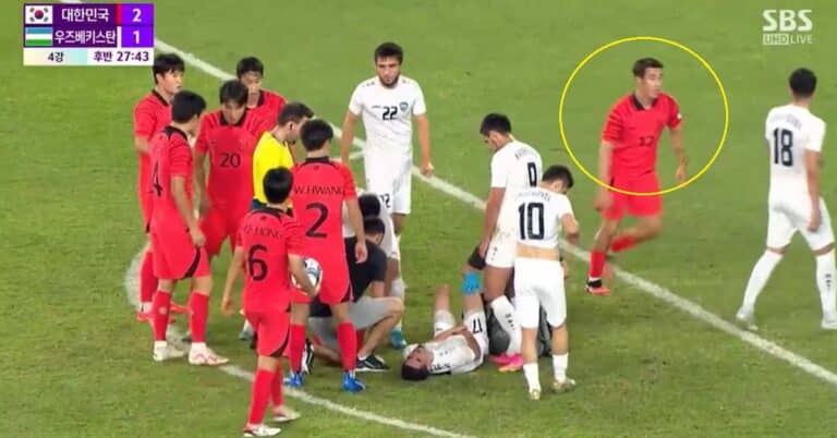 다리만 노리는 태클로 엄원상에게 부상을 입힌 우즈벡 선수. 그런데 반칙이 선언되자 오히려… 저 플레이를 하고 반칙이 아니라 생각한 건가 ㄷㄷ