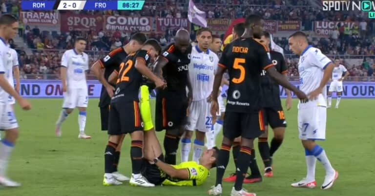 로마vs프로시노네 경기 도중 갑자기 쥐가 나서 쓰러진 주심 ㅋㅋㅋㅋ 그러자 주심 쥐 풀어주는 로마 선수들 갑자기 왜 쥐가 났나 했더니… 알고보니 로마 선수한테 파워 몸통 박치기 당했네 ㅋㅋㅋㅋㅋㅋㅋ