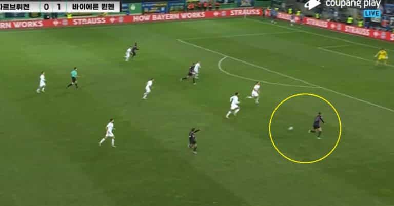 오프사이드 라인 완전히 깨부수며 뮐러가 전달한 패스. 하지만 사네는 포기한 뒤 뮐러에게 신경질 ㄷㄷ
